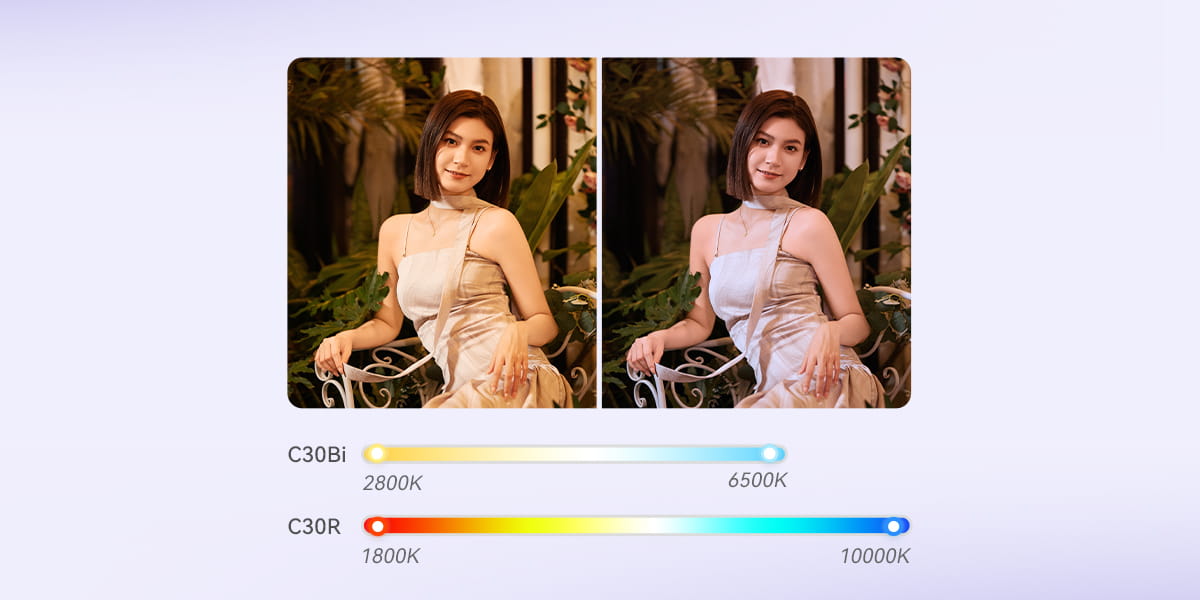 C30Bi дозволяє регулювати колірну температуру в діапазоні від 2800K до 6500K, тоді як C30R пропонує ще ширші можливості — вражаючий діапазон від 1800K до 10000K, що ідеально підходить для будь-яких творчих завдань.